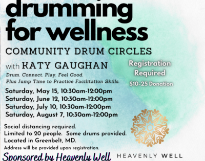 This summer, reconnect with community and support your wellness with in-person drum circles led by Katy Gaughan and sponsored by Heavenly Well.