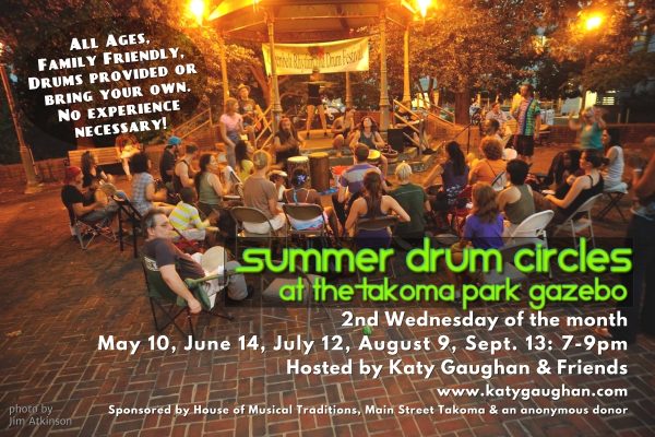 4 years strong, the Summer Drum Circles at the Gazebo feature community drumming, dancing, hooping, hanging, laughing and everyone having a good time! All ages, family friendly, little or lots of experience welcome! Drums & instruments provided or bring your own. Hosted and facilitated by Katy Gaughan, Drumming for Wellness.